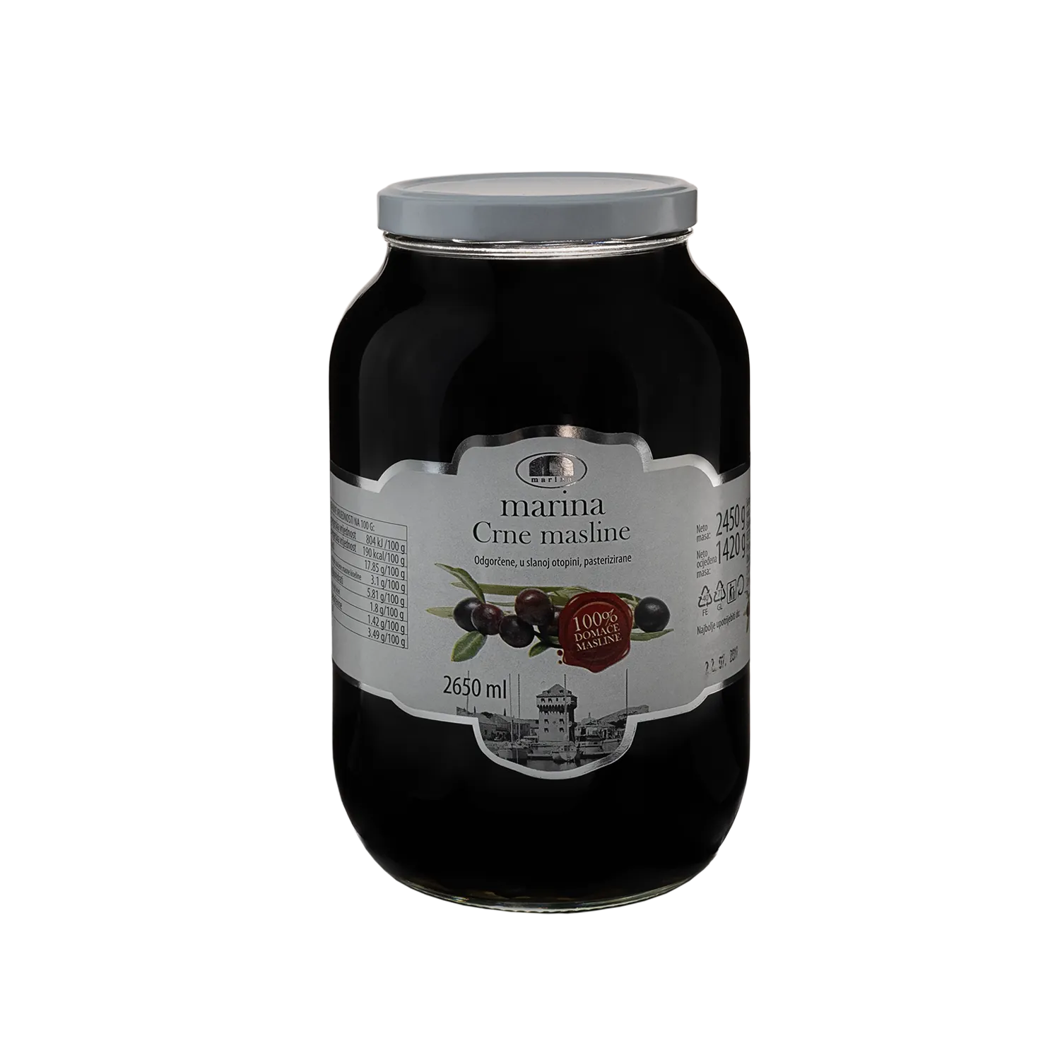 Naša crna maslina, Marina, je 100% domaćeg podrijetla, otkupljena od naših zadrugara, te obrađena vlastitom tehnologijom.